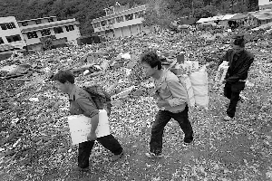 有村民肩上背著從廢墟中扒出的幾十斤臘肉,有的用被單裹著幾件單衣,空隙處,塞滿牛奶和火腿腸。