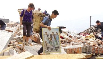 受災(zāi)群眾從廢墟中撿拾自己的東西,準備重建家園。夏永 攝