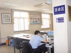 記者看到張文的房間里住著8名被治安拘留的人員,其中有4人都是醉酒被拘留的司機(jī)。醉酒被拘人員每天早晨6時30分起床洗漱,然后開始打掃宿舍衛(wèi)生,7時10分開始吃早餐,兩個饅頭,稀飯就咸菜。上午除了參加交通法規(guī)集中學(xué)習(xí)和聽廣播外,其余時間都是打掃衛(wèi)生或者幫著民警干一些雜活。上午11時開始吃午飯,內(nèi)容還是饅頭稀飯咸菜。中午12時至14時是午休時間。