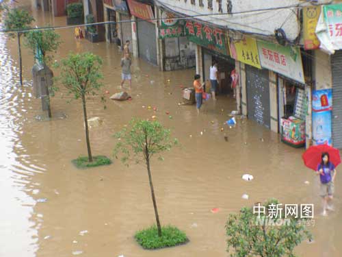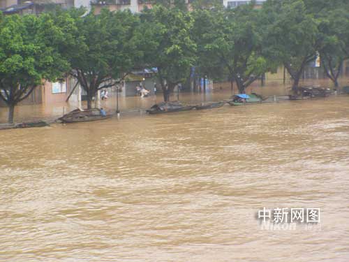 從今晨開始,流經(jīng)韶關(guān)市區(qū)的湞江和武水(均為廣東北江支流)均已漫過河堤,淹浸部分街市。記者看到,位于市區(qū)風(fēng)度路步行街南端的中山公園已是一片汪洋,園前西路亦成澤國,有人以小船代步,或用小艇裝運(yùn)雜物。而在火車站附近的某大型超市,記者則看到購買大米、蔬菜、速食面、瓶裝水等物品的顧客明顯比往日多,但商場內(nèi)這些物品貨源充足,貨架不斷空架,又不斷補(bǔ)足充滿。
