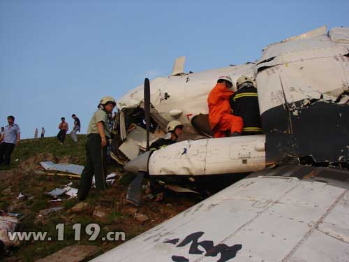 由于失事地點位于山區(qū),消防救援車輛行進至距現(xiàn)場10公里處已無法繼續(xù)前進。消防官兵迅速攜帶救援裝備徒步行走,山高坡陡,道路極其難行,消防官兵于18時30分左右趕到飛機失事地點。救援人員發(fā)現(xiàn)失事飛機破損嚴(yán)重,右側(cè)發(fā)動機仍在正常運轉(zhuǎn),未發(fā)生火災(zāi)。機艙外遇難者尸體兩具,機艙內(nèi)遇難者尸體一具、受傷被困者一名。消防官兵迅速利用剪斷器、擴張器等工具將機體破拆,于18時50分將被困人員成功救出,隨后又將另一名機艙內(nèi)遇難者救出。并將獲救人員送上120急救車,但是飛機的右側(cè)發(fā)動機仍在高速運轉(zhuǎn),外殼已變色。消防官兵僅用兩分鐘時間關(guān)閉了外殼已發(fā)紅的發(fā)動機,但此時機翼竄出火苗,消防官兵利用滅火器和沙土迅速將火災(zāi)撲滅。