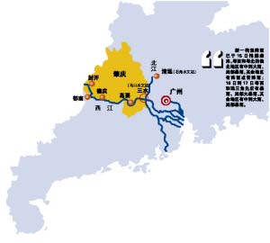 據(jù)省水文局最新預(yù)報:西江高要水文站將于16日凌晨出現(xiàn)48000立方米每秒的洪峰流量,超過20年一遇量級洪水,洪峰水位11.4米,超警戒水位1米以上。由于北江與西江兩股洪水將于16日在三水匯合,因此,屆時西江最下游的馬口水文站將于16日中午出現(xiàn)8.4米的洪峰水位,超過50年一遇量級。