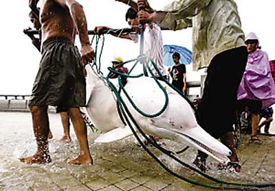 下午4時(shí)10分,村民們將白海豚抬到岸上(見(jiàn)左下圖)。半個(gè)小時(shí)后,白海豚被裝上汽車送往廣州。