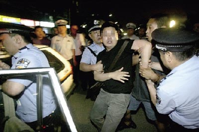 “我是警察,誰(shuí)敢動(dòng)我!”昨晚,民警將一位穿黑上衣、滿嘴酒氣的男子帶回調(diào)查時(shí),這名男子拉住警車(chē)門(mén)。當(dāng)晚,(北京)豐臺(tái)城管聯(lián)合警方對(duì)城南嘉園小區(qū)附近的露天燒烤進(jìn)行檢查時(shí),正在吃飯的這名男子和其女伴拒絕離開(kāi)。經(jīng)初步調(diào)查,該男子為本市一名民警。