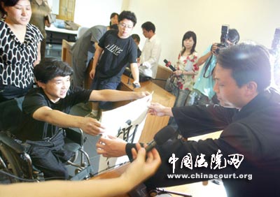 今天上午,吳華林坐著輪椅在其妻子的陪同下來(lái)到一中院聽候宣判,法官宣布判決結(jié)果,要求全體起立時(shí),坐在輪椅上的吳華林用雙手撐住輪椅的扶手身子挺了起來(lái)。聽到宣判結(jié)果,吳華林臉上露出了滿意的笑容。他拿出自己寫的“愛”字和“謝謝”的條幅贈(zèng)送給法官,表達(dá)自己的感謝之情。