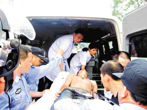 警察和醫(yī)護人員將受傷的匪徒抬上救護車。