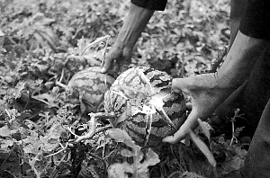 昨日下午6時許,露天瓜地中隨處可見被砸裂的西瓜,有的“傷口”就像子彈打進(jìn)去一般!靶颐獾暮苌!惫限r(nóng)張平翻看瓜秧,藏在下面的西瓜也裂了口。