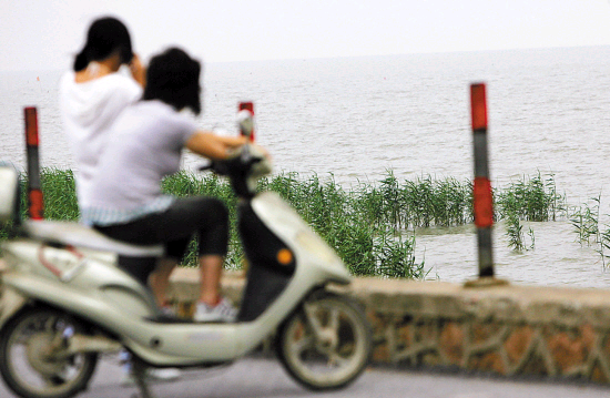 太湖湖水上漲,岸邊的蘆葦只剩頂部一段沒有被淹沒。