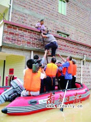 昨日下午4時(shí)許,筆者在該縣播植鎮(zhèn)龍福村委看到,屬下的龍村、羅榕、灣頭等10條村莊已是一片澤國(guó),村道一端和樓房上零星散布的村民正在等待救援,幾艘沖鋒舟和橡皮艇來回穿梭,把村民們載到安全地帶(如右圖)。從市里全會(huì)請(qǐng)假回來的縣委書記譚培安也親臨“澤國(guó)”指揮救援,數(shù)十名縣鎮(zhèn)領(lǐng)導(dǎo)干部正在現(xiàn)場(chǎng)忙碌,村中還不時(shí)傳出如放鞭炮般的倒房聲。一位剛剛被救出的80歲的阿婆說,活這么大歲數(shù)還未見過如此大的暴雨和山洪。據(jù)悉,該鎮(zhèn)前日起遭受暴雨襲擊,導(dǎo)致當(dāng)?shù)貝偝呛臃簽E,河基崩潰嚴(yán)重,河水倒灌入村,受浸村莊10多條,受困村民2526人,倒塌房屋117戶352間。前晚起,縣、鎮(zhèn)、村干部齊出動(dòng),分頭深入受災(zāi)村莊連夜動(dòng)員村民撤離,至昨日下午,已全部安全轉(zhuǎn)移。(圖/文談細(xì)育龍?jiān)S李均陽)