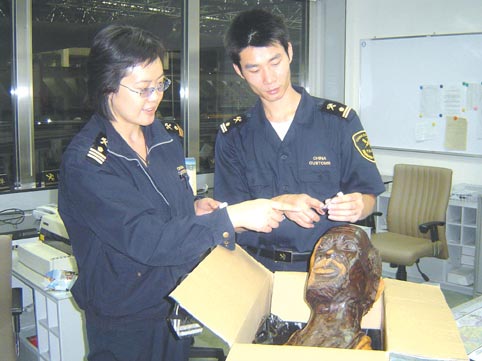 有一次,廣州海關(guān)在一件工藝品中查獲毒品,該工藝品呈圓盤(pán)狀,是用樹(shù)脂材料制成的頭像,整個(gè)工藝品渾然一體,毒品都藏匿其中,表面沒(méi)有一絲破綻,并且在圓盤(pán)的周邊都沒(méi)有藏匿毒品,所有的毒品都藏匿在頭像面部的突起部位。(記者蔡巖紅)