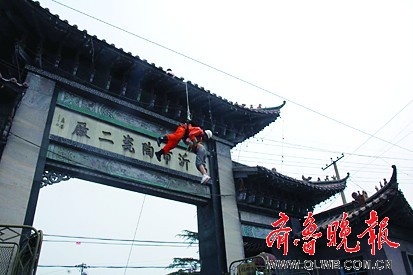 就在此時(shí),消防員飛身?yè)淞松先,將該女子抱住。由于這名女子拼命掙扎,二人雙雙從門樓上掉了下來(lái),幸虧消防員身上的繩子才使兩人懸在半空中。