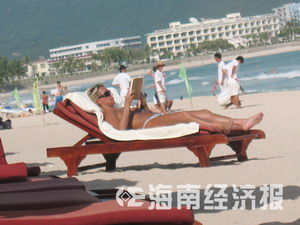 在寶宏酒店沙灘,一名外國女性客人在沙灘椅上裸露著上半身悠閑看書,隔之不遠處有一名外國男客人一會下海,一會上岸裸曬,全然不顧身旁在沙灘上玩耍的國內(nèi)游客。