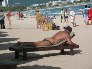 在南中國酒店西側(cè)海灘,十多名男子赤裸裸地曬太陽,裸曬者均為男性,他們?nèi)沓嗦,皮膚曬得很黑。據(jù)裸曬者自己解釋,他們裸曬是為了治療皮膚病。記者問他們?yōu)槭裁床贿x擇隱蔽的地方裸曬,他們并沒有回答。