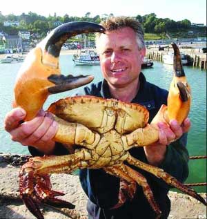 英國白金漢郡愛斯勃雷市潛水員保羅·沃斯利在多塞特海岸的利米灣潛水時,竟然在48米深處的一艘戰(zhàn)艦殘骸下發(fā)現(xiàn)了一只重達7.7公斤、寬達30厘米的“妖怪螃蟹”!沃斯利冒著危險將這只“超級螃蟹”捉上了水面,專家相信,這只螃蟹是全世界曾經(jīng)捕上岸來的最大可食用螃蟹。