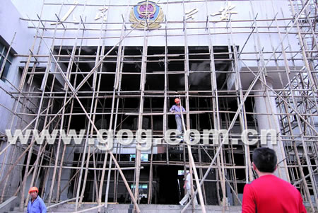 昨日中午1時許,記者來到甕安縣公安局,整棟大樓已開始清理、維修,大樓前部已搭起維修竹架,民工正在忙著修復(fù)被燒的大樓。