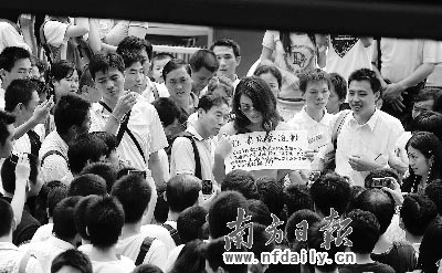 昨日(7月8號(hào))下午2時(shí)許,一身著粉紅色衣服、戴太陽鏡、穿黑色網(wǎng)狀絲襪的摩登女郎現(xiàn)身深圳福田區(qū)華強(qiáng)北曼哈購物廣場(chǎng)前,脫掉上衣,只留下黑色內(nèi)衣,手舉“徐滇慶再道歉,因賭房?jī)r(jià)教授徐滇慶僅在某報(bào)刊登半版道歉廣告引起部分市民不滿,身為徐老粉絲,本人獻(xiàn)玉體做版,為其追補(bǔ)道歉,以求對(duì)其諒解!”的牌子引來眾多路人圍觀、議論。