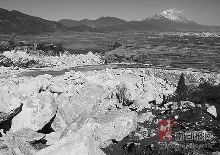 站在麗江城區(qū)的高樓之上,向玉龍新城區(qū)與文筆海遠(yuǎn)眺,首先看到的便是文筆山青山綠水間面山的傷痛。遠(yuǎn)看似乎是一個采石場,走近才看清是一條盤旋的道路。