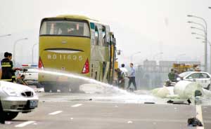 昨天下午4時,記者趕到事發(fā)現場,看到大巴車停在第二車道,車子后部地下有兩三個破裂的白色油桶,地上淌著許多綠色液體,還在冒著縷縷青煙。大巴兩側車窗已經破碎,車頭的擋風玻璃也已破裂呈蜘蛛網狀掛在車頭,車下有火燒過的黑色痕跡。