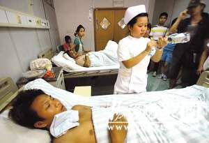 大約過了5分鐘,除了現(xiàn)場的四名城管,又趕來十幾名城管隊員,他們把老俞團團圍住。當(dāng)時正在菜場附近的老俞兒子聞訊趕來。21歲的小俞躺在病床上有氣無力地說:“我跑來就說了一句話,你們不要打我爸爸,然后就想拖他離開?墒怯谐枪荜爢T卻說打的就是你們!”城管隊員圍著老俞父子一陣拳打腳踢,小俞說感到眼前一黑,醒來時已經(jīng)在醫(yī)院了。醫(yī)生告訴記者,老俞多處軟組織受傷,頭部也有骨折跡象。