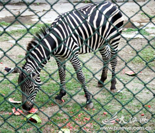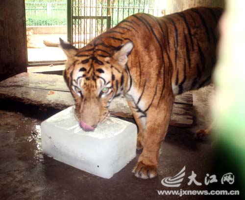 16日,記者在南昌市動(dòng)物園看到,老虎正抱著大冰塊睡著大覺(jué)!疤鞖馓珶幔覀兠刻於家慕600公斤冰塊為5只老虎降溫。3只大象每餐也要吃掉約75公斤西瓜!憋曫B(yǎng)員告訴記者。記者看到,河馬喜歡泡在水池里,熊貓則躲在空調(diào)房里愜意地打著盹,大象、斑馬忙著啃西瓜。
