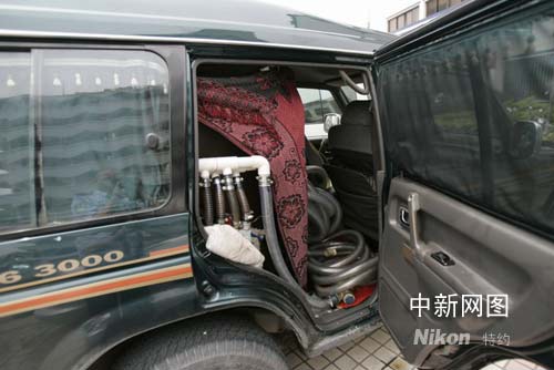 記者今日在佛山市張槎派出所內(nèi)看到,“油耗子”將吉普車改裝成的油罐車內(nèi)“裝備”齊全,車輛側(cè)窗和尾窗玻璃用布簾遮得嚴(yán)嚴(yán)實(shí)實(shí),根本看不到車內(nèi)的情形。