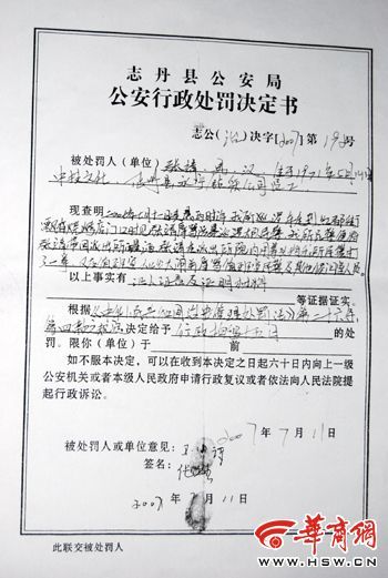 在志丹縣公安局公安行政處罰決定書上寫著:七月十一日凌晨?jī)蓵r(shí)許,我所巡邏車走到紅都街飄香燒烤店門口時(shí),見(jiàn)張靖辱罵防暴大隊(duì)民警。我所民警便將張靖帶回派出所醒酒,張靖在派出所院內(nèi)用拳頭將我所民警打了一拳,又在值班室大吵大鬧并辱罵值班室民警及其他候問(wèn)室人員。根據(jù)《中華人民共和國(guó)治安管理處罰法》第二十六條第四款之規(guī)定,決定給予行政拘留十五日的處罰。