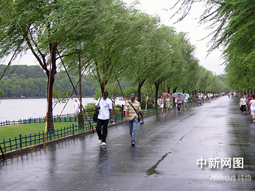 白堤上的老外冒雨游西湖。作者 李克偉
