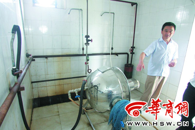 離開女澡堂后,記者來到西安美辰藥業(yè)有限公司的生產(chǎn)操作間,走進(jìn)操作間,沒有發(fā)現(xiàn)這家制藥企業(yè)有消毒設(shè)施?帐幨幍臐嵕呦鹃g,凌亂地?cái)[放著幾個(gè)拖把,一個(gè)自來水閥和一個(gè)水池。