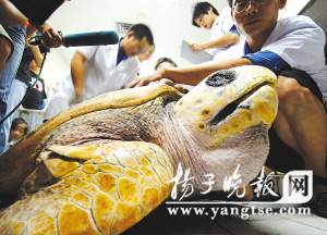 昨天上午9點(diǎn)鐘,海底世界搭起的手術(shù)室里十分安靜,呈現(xiàn)出土黃色的大海龜一動不動地趴在地上。“吼,吼”,低沉而又艱難的呼吸聲讓人感覺到它異常痛苦。