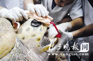 要說手術(shù),談何容易,海底世界水族館的獸醫(yī)說,像這樣的手術(shù)他們也還是第一次做,沒有任何資料可以參考。“是最耐心、難度最大的一次,作為冷血動物的大海龜,它的結(jié)構(gòu)和人體完全不一樣,我們原來不太了解海龜?shù)慕Y(jié)構(gòu)!