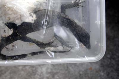 7月31日上午7時(shí)許,石井邊防派出所民警在泉州市南安石井碼頭對(duì)來靠臺(tái)灣貨輪進(jìn)行例行檢查時(shí),在船上的洗浴間內(nèi)發(fā)現(xiàn)了兩個(gè)可疑的紙箱,紙箱內(nèi)有幾十個(gè)大小不一的塑料盒子,盒子內(nèi)裝有色彩繽紛、形態(tài)各異的蜥蜴、青蛙、烏龜?shù)扰佬袆?dòng)物,約有200余只。隨后,邊防民警又在碼頭上抓獲了前來取貨的周某。