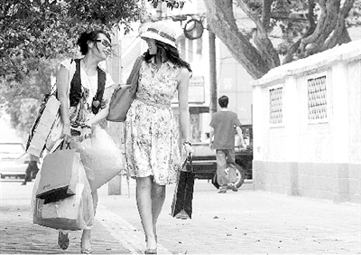 小白(左)不但陪客戶逛街,還幫她提物品。 常亮/攝