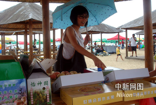 中新網(wǎng)上海八月七日電 (萬軍)見過穿著比基尼的時(shí)尚男女沙灘上品蟠桃的逍遙情景嗎?這幾天里,在上海金山城市沙灘上,鼎鼎大名的“皇母”蟠桃成為沙灘男女的新寵,這種上海市面上也難得一見的世博會(huì)特供“蟠桃仙果”,這次與扎堆沙灘的時(shí)尚男女來了一次親密接觸。