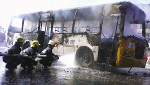 據(jù)目擊者張先生介紹,當(dāng)時(shí)他看到“208”突然冒起了黑煙,隨后就聽到“砰”的一聲響,駕駛室全著了。正當(dāng)他撥打報(bào)警電話時(shí),公交車司機(jī)從后門摔了下來,渾身直冒煙。隨后,受傷的司機(jī)被“120”送往醫(yī)院。