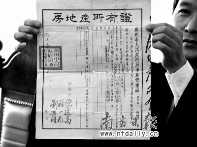 原告代理律師向記者出示吳老太留下的這份房產(chǎn)證。洪奕宜攝