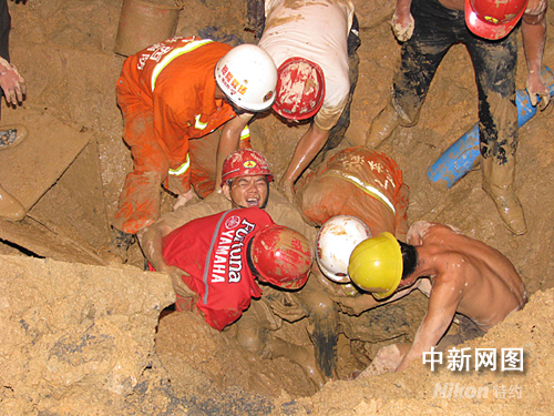 17時06分,一輛大型鉤機到達現(xiàn)場,將深坑下的大塊水泥板鉤出,為救援取得空間。18時35分,現(xiàn)場救援人員發(fā)現(xiàn)被困男子出現(xiàn)瞌睡現(xiàn)象,醫(yī)護人員立即取來葡萄糖,由于救援空間限制無法給男子打點滴,醫(yī)護人員只好讓男子喝下葡萄糖,并為男子接上氧氣,且讓一名工友陪同講話,防止男子昏睡。19時10分,經(jīng)過現(xiàn)場救援人員的努力,一直壓在男子身上的斗車被吊離,男子右腿被成功救出。但是由于男子是半跪姿勢,背部大石塊妨礙了左腿救援,無法將左腿拿出,消防隊員和其他工人只好采取手刨的方式,一點一點將男子左腿膝蓋前泥土挖出。經(jīng)過3個多小時的營救,19時50分,男子被成功救出,經(jīng)醫(yī)生初步診斷,男子雙腿無大礙。