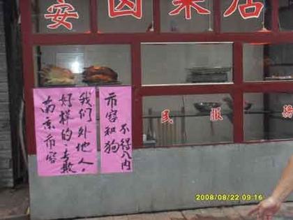 記者發(fā)現(xiàn),這個帖子已被不少網(wǎng)站轉載,照片上顯示,一家有“鹵菜店”字樣的櫥窗下貼著一大一小兩張標語,上面分別用毛筆寫著“南京市容好樣的,專欺我們外地人”和“市容和狗不得入內(nèi)”。照片上還有拍攝日期,為“2008年8月22日上午9點16分”。