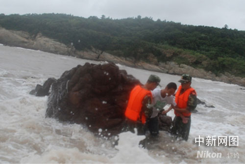 圖為洞頭邊防戰(zhàn)士們從礁石上將癡心少年救出。賀應(yīng)欽 攝影