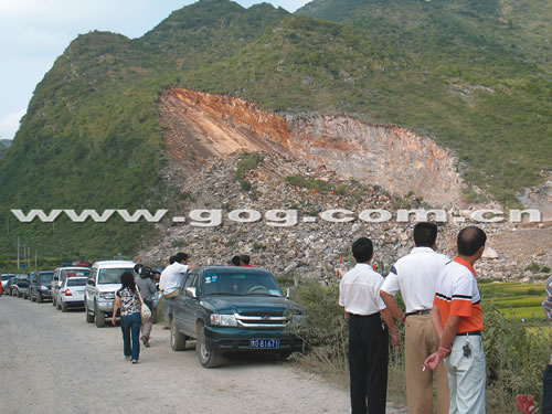 在山腳的左側(cè),是普定縣臨時(shí)搭建的搶險(xiǎn)救援臨時(shí)指揮部,相關(guān)部門的人員正在緊張工作,在通往事故現(xiàn)場(chǎng)的公路上,幾臺(tái)大型裝載機(jī)、挖掘機(jī)正向現(xiàn)場(chǎng)駛?cè)ァ?/p>