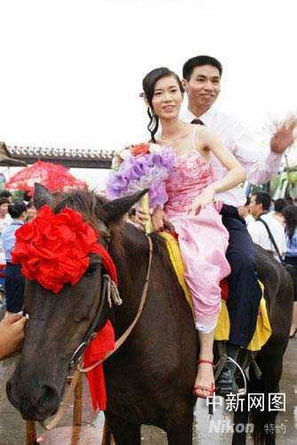 中新網(wǎng)順德9月23日電 (孫建駒 謝俊忠)大鼓擂響,嗩吶聲聲,一支百余米長的迎親隊伍中,有高頭大馬、花轎和卡丁車、電瓶車、摩托車、沙灘車、自行車等交通工具,隊伍熱鬧穿越廣東順德長鹿農(nóng)莊,28對新人在這里舉辦別具水鄉(xiāng)特色集體婚禮。