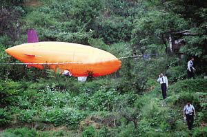 25日下午3點(diǎn),岷山昆明制藥廠內(nèi),一“不明飛行物”突然闖入,降落在半山腰上,周圍近百住戶上山圍觀,一些人以為是UFO,數(shù)輛警車載著近30名警察趕到現(xiàn)場(chǎng)。其實(shí),“不明飛行物”只是一艘普通的飛艇,是某航模公司與某火電廠架設(shè)高空電線用的,因?yàn)橄掠,遙控器失靈,發(fā)動(dòng)機(jī)停止工作,最后落了下來(lái)。(據(jù)都市時(shí)報(bào))
