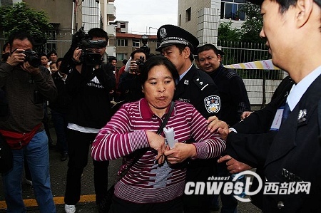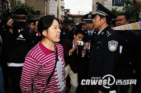 中午10:30 在雨中等待了2個多小時的羅大翠接到一個電話,在通話的過程中,羅大翠的情緒變得更加激動起來,隨即和執(zhí)勤民警交涉起來,試圖越過警戒線,闖進法庭。但是兩次努力都被執(zhí)勤民警婉拒。截至27日上午11時30分,周正龍案已經(jīng)開庭審理了3個小時,周正龍妻子羅大翠和兒子仍未被允許進入法庭。(記者 錢海峰 陳武)