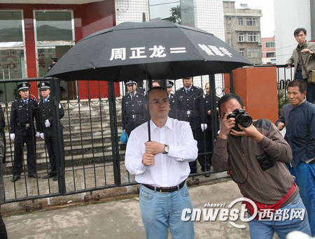 郝勁松得知判決后在法庭外撐起一把黑傘