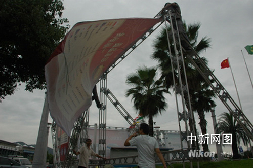 工人在浙江臺州一國慶車展現(xiàn)場加固施工,以應(yīng)對超強(qiáng)臺風(fēng)“薔薇”的到來。作者:陳林聰