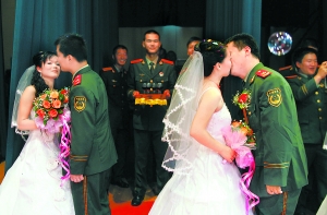 “非常有紀念意義!鄙衔9時,警官王忠燦摟著他美麗的新娘,開心地評價著即將開始的集體婚禮。9時25分,包括王忠燦在內(nèi)的21名武警北京總隊十三支隊的新郎官,分別背著他們的新娘,登上貼著喜字的大轎車。在威風鑼鼓的喜樂中,悍馬指揮車引導(dǎo)著婚車,緩緩向警營駛?cè),一場別開生面的集體婚禮開始了。