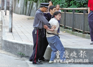 昨天清晨,一男子潛入南岸區(qū)南坪麗華酒店5樓洗腳城盜得一部手機后,被酒店保安江海濤追上。小偷掏出幾張百元大鈔哀求江海濤放行,被拒后翻臉抽出刀子威脅。江海濤徒手與毛賊展開搏斗,在趕來的同事的幫助下,將毛賊制服并扭送派出所(如圖)。