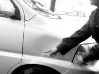 昨日15時(shí)40分,記者來(lái)到位于正義路市公安局對(duì)面的輔路上,只見一名30來(lái)歲的青年男子倚在警車旁邊,大半個(gè)身子倒在地上意識(shí)迷湖,民警正在一旁詢問情況。警車的身后停著三輛有城管標(biāo)志的車,其中一輛金杯車的前蓋右側(cè)處有一個(gè)坑,表層的鐵皮明顯凹陷 (見圖),車身上寫著“崇文綜合執(zhí)法”,還有一輛車的車斗上有一輛舊三輪車,城管工作人員稱,該三輪車是被暫扣的非法無(wú)照運(yùn)營(yíng)車輛。
