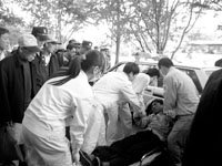 昨日16時(shí)10分,120急救車趕到現(xiàn)場(chǎng),醫(yī)護(hù)人員用擔(dān)架將該男子抬上救護(hù)車(見圖)。但青年男子的同鄉(xiāng)們拒絕隨同急救車前往同仁醫(yī)院,而是守在原地不讓城管的執(zhí)法車輛離開。經(jīng)民警上前調(diào)解后,他們才離開現(xiàn)場(chǎng)。