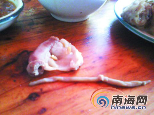 下午2時許,記者趕到位于海口美苑路的該骨湯店,看到王先生一行人坐在餐桌旁正和店方交涉。餐桌一角的豬粉腸旁邊赫然橫著一條約9厘米長的寄生蟲。