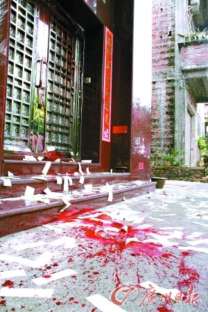 昨日(10)凌晨,佛山市順德區(qū)新隆村村主任陳某的宅所遭襲。陳宅的大門被人用鐵鏈反鎖,并澆滿紅油漆,肇事者臨走前,還在門口點(diǎn)起了白蠟燭,撒下了大量冥幣和紙錢。
